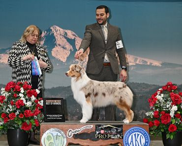 Fern is a stunning red merle bitch bred by Yoland Lininger, AJ Tarares III, and Matt Mulin. Fern was born October 2020 during the pandemic and was placed with Rylee in September 2021. Fern is making progress learning her way around the ring and at her second AKC all breed show in Lewiston, Idaho, went BOS. Fern has the sweetest personality, loves playing with the other dogs and her favorite game right now is playing with the "chuck-it" and rope, followed by puzzle games. She is a quick learner with tricks/commands, enjoys going on her bicycle rides and loves going for car rides.